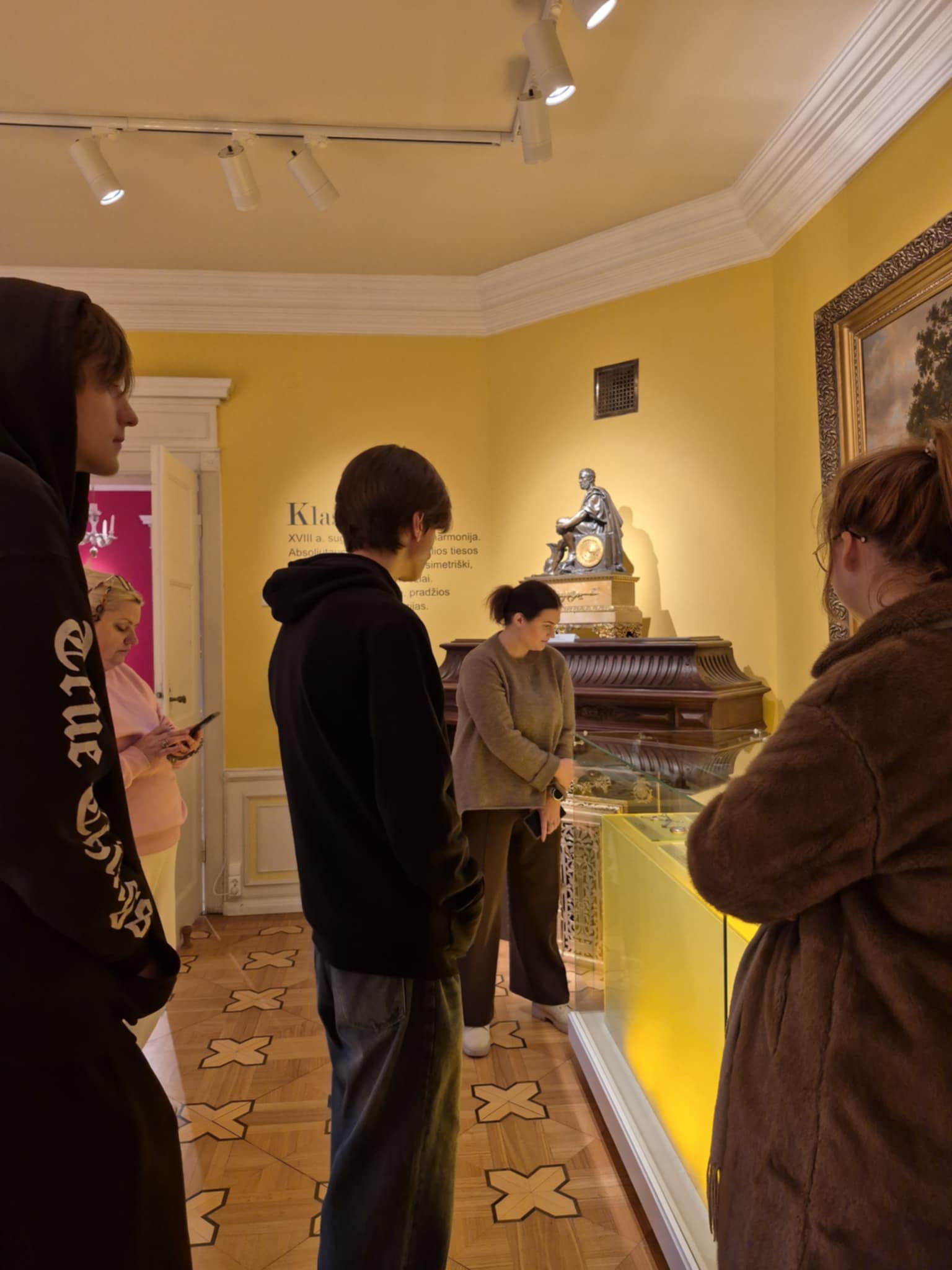 Lapkričio 26 d. I-IV kl. gimnazistai lankėsi edukacinėje išvykoje Klaipėdos laikrodžių muziejuje ,,Laiko bangomis“. Klaipėdos laikrodžių muziejus – vienas unikaliausių muziejų Lietuvoje ir Šiaurės Europoje. Laikrodžių ekspoziciją sudarė dvi dalys. Pirmame aukšte atskleidžiami laiko matavimo principai ir laikrodžių konstrukcijų raida nuo senovės iki šių dienų. Su dideliu susidomėjimu apžiūrėjome senovinius kalendorius, saulės, vandens, ugnies, smėlio bei XVII-XX a. mechaninių laikrodžių originalus. Antrame aukšte gėrėjomis mechaninių laikrodžių formų ir dizaino kitimu nuo renesanso iki moderno stiliaus (XVI-XX a). Sužinojome, kaip atrodė laikrodininko dirbtuvė Renesanso epochoje. Ypač sudomino laikrodis su lietuviškais Vyčiais, esančiais Abiejų Tautų Respublikos herbe, pagamintu Vokietijoje, Karališkojoje porceliano manufaktūroje. Manoma, kad eksponuojamas laikrodis buvo pagamintas pagal specialų užsakymą – 300-ųjų ATR įkūrimo jubiliejui paminėti. Sužavėjo prabangių baroko epochos bei XVIII a. rokoko stiliaus, plastiškų formų porcelianinių laikrodžių paroda. Apžiūrėjome garsių Europos ir Lietuvos laikrodininkystės meistrų – vilniečio Teodoro Tarasovigo, šveicarų Abrahamo Lui Bregės, Teodoro Pereto ir kitų darbus. Ekspozicijoje eksponuojami daugiau nei 1700 originalių bei retų laikrodžių ir rekonstrukcijų.