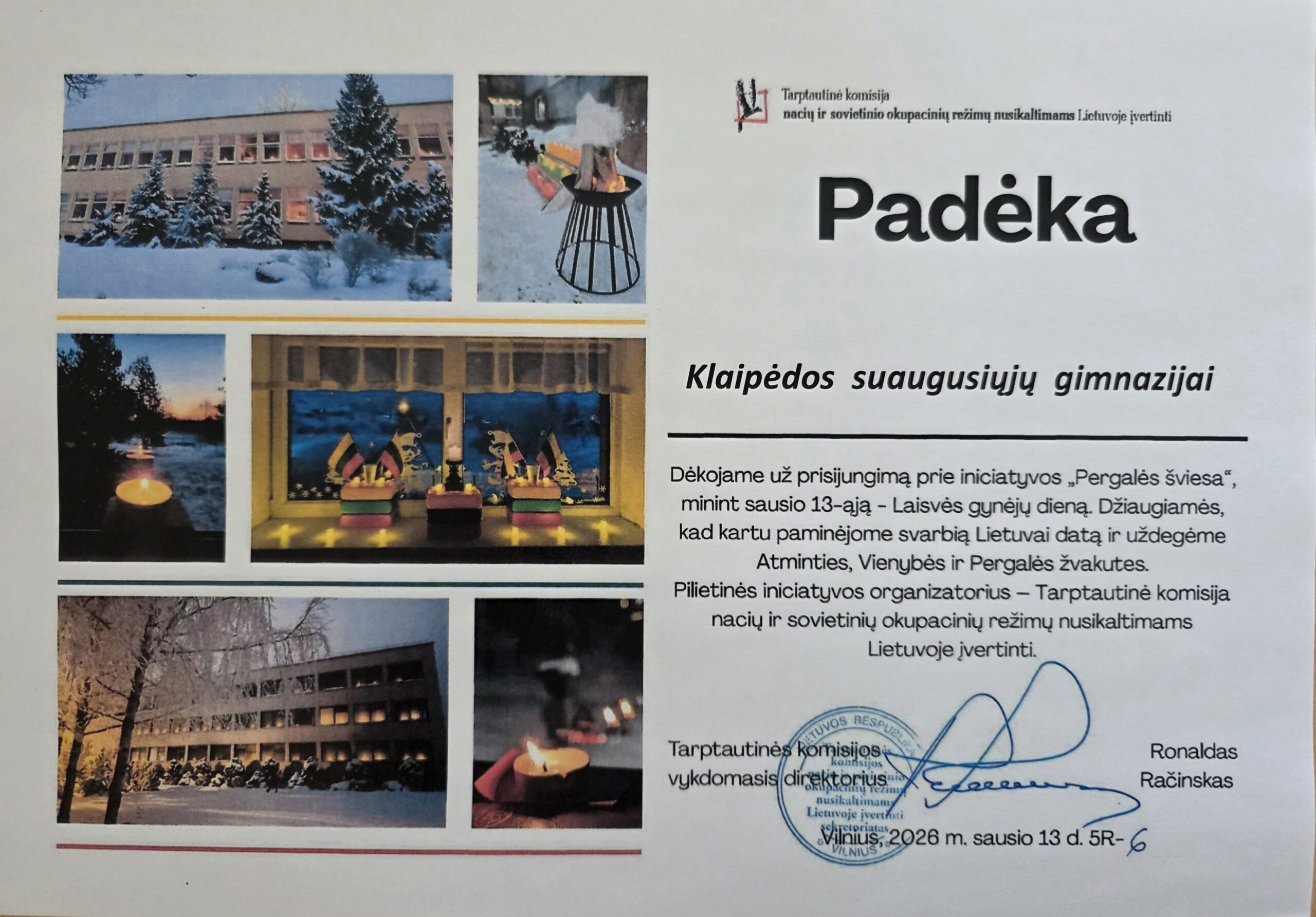 Sausio 13-oji tapo įrodymu, kad vienybė ir susitelkimas gali daugiau nei ginklai. Tvirtas vertybinis pagrindas yra svarbiausia mus jungianti jėga, kurios masto įvertinti negali iškreiptų vertybių pasaulyje gyvenantis priešas. Minint Lietuvos Laisvės gynėjų 35-ąsias metines sausio 13-osios rytą Klaipėdos suaugusiųjų gimnazijos languose sužibo atminimo, vienybės ir pergalės žvakučių liepsnelės.