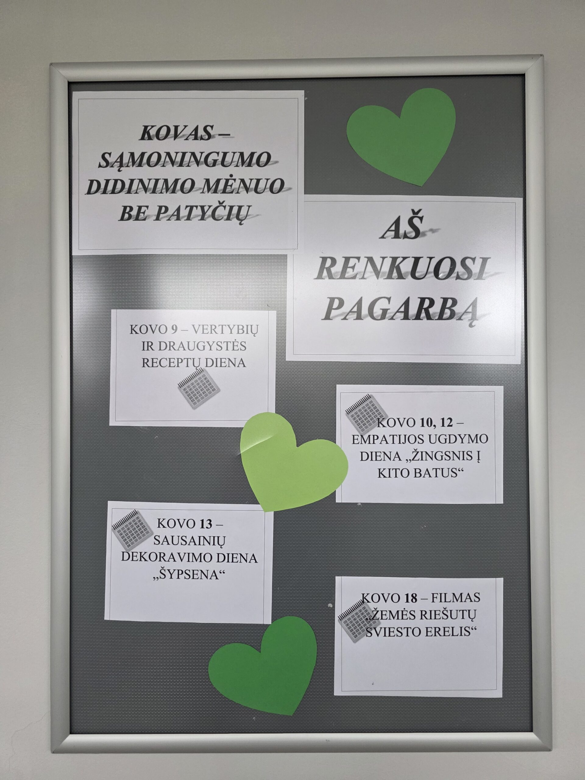 Kovo mėnesį mūsų gimnazijos Jaunimo skyriuje minėjome sąmoningumo didinimo laikotarpį be patyčių. Iniciatyvos „Aš renkuosi pagarbą” metu organizavome įvairias veiklas, kurios skatino bendruomeniškumą, empatiją, supratimą ir atvirumą. Mokiniai dalyvavo filmo peržiūroje, po kurios vyko prasmingos diskusijos aptariamomis temomis. Taip pat netrūko kūrybiškų veiklų – visi norintys galėjo išbandyti sausainių dekoravimą, kurti draugystės „receptus”, dalyvauti žaidime-loterijoje „Kito batuose”.